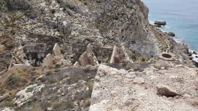 Erst im Bereich der Verladestation in Agua Amarga sind dann wieder Überreste des Bahntrassees, der Gebäude und Anlagen ersichtlich.