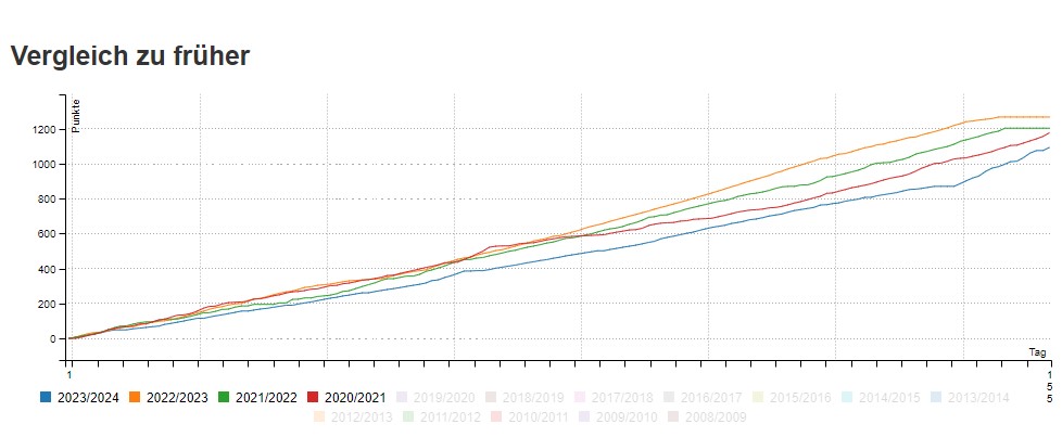 Angezeigt sind die kumulierten Punkte aus dem Winterpokal des jeweiligen Winterhalbjahres. Die allermeisten Punkte kommen bei mir aus Radfahrten zusammen. Ein paar wenige aus NordicWalking. Seit dem Winter 2022/23 fahre ich auch regelmässig auf dem Smarttrainer. In der Grafik ist der Ursprung der Punkte aber nicht ersichtlich.