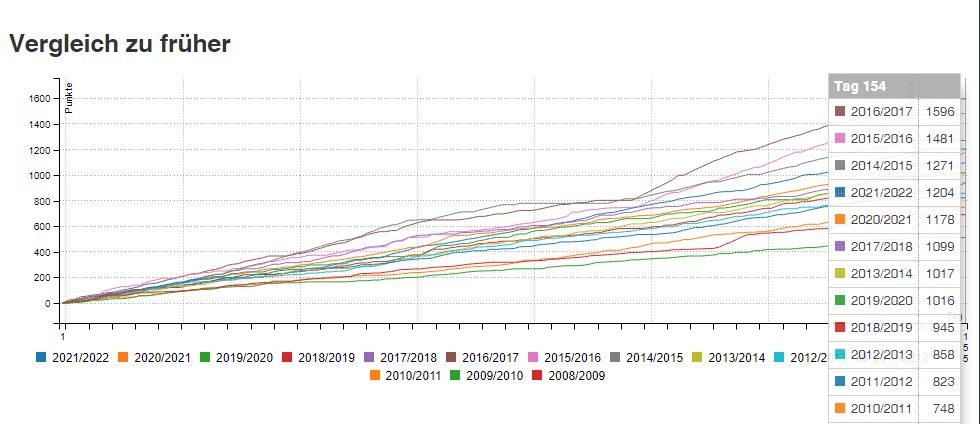 Angezeigt sind die kumulierten Punkte aus dem Winterpokal des jeweiligen Winterhalbjahres. Die allermeisten Punkte kommen bei mir aus Radfahrten zusammen. Ein paar wenige aus NordicWalking. In der Grafik ist der Ursprung der Punkte aber nicht ersichtlich.